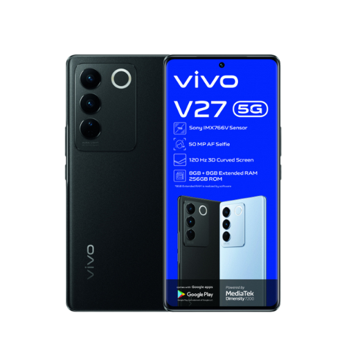 The Vivo V27 256GB, a high-end midrange smartphone, was launched in March 2023. It showcases a 6.78-inch FHD+ AMOLED display with a resolution of 1080 x 2400 pixels and a 120Hz refresh rate for vivid and seamless visuals. Powered by the MediaTek Dimensity 7200 chipset, it guarantees efficient performance and smooth multitasking.
